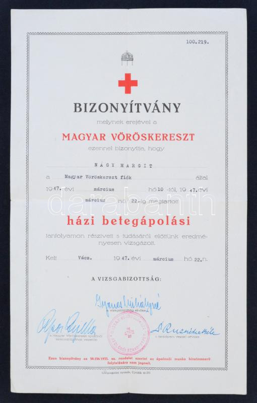 1947 Vöröskeresztes bizonyítvány Apor Gizella (1886-1971) bárónő és má... https://www.darabanth.com/de/279-Fernauktion/279.0/Andere-Sammelgebiete/Dokument~16/1947-Voroskeresztes-bizonyitvany-Apor-Gizella-1886-1971-barono-es-masok-alairasaival~II1438474