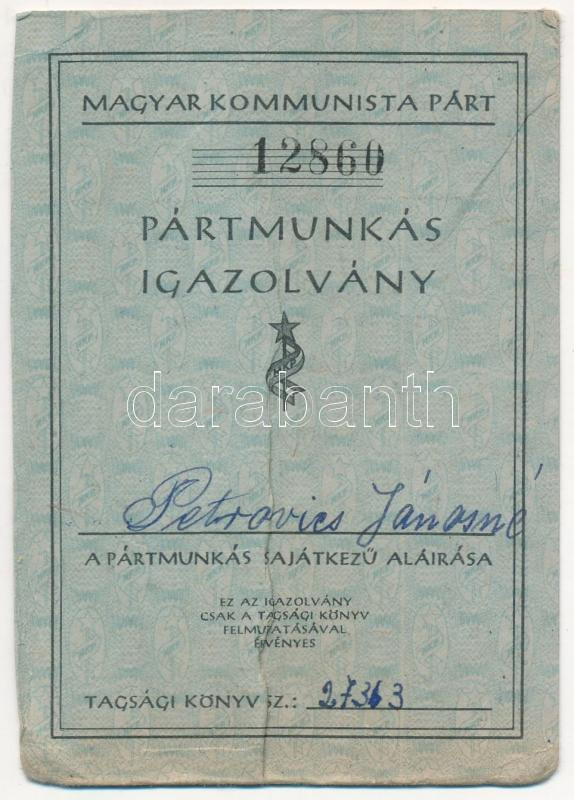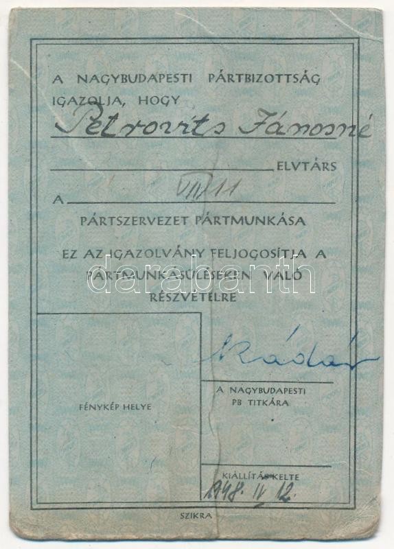 1948 Pártmunkás igazolvány, Magyar Kommunista Párt, Kádár János aláírá... https://www.darabanth.com/de/279-Fernauktion/279.0/Andere-Sammelgebiete/Dokument~16/1948-Partmunkas-igazolvany-Magyar-Kommunista-Part-Kadar-Janos-alairassal-11x7cm~II1434311