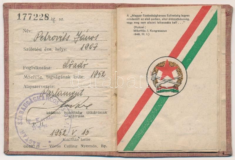 1952 Tagsági könyv, Magyar Szabadságharcos Szövetség, sok bélyeggel, 1... https://www.darabanth.com/de/279-Fernauktion/279.0/Andere-Sammelgebiete/Dokument~16/1952-Tagsagi-konyv-Magyar-Szabadsagharcos-Szovetseg-sok-belyeggel-10x7cm~II1434290
