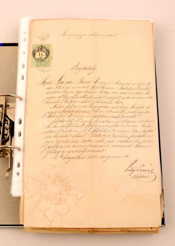 Beschreibung: Vegyes okmány tétel: különféle levelek, szerződések, engedélyek, stb., egy részük viaszpecséttel, okmánybélyegekkel, mappába rendezve, összesen 95 db