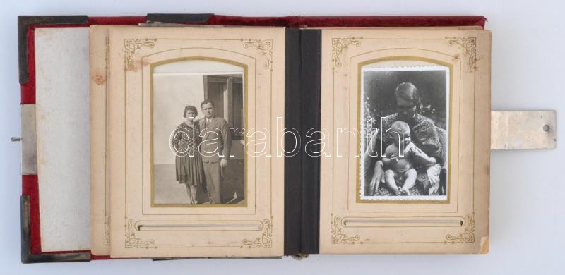 Beschreibung: 1930-1950 Családi fotóalbum, kb. 40 db., rossz állapotú fémveretes bársony fotóalbumban, különféle méretben.