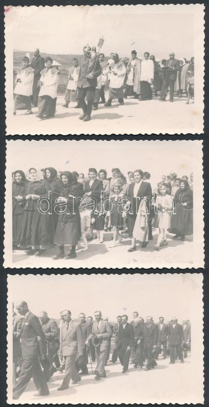Beschreibung: 1952 Sepsi búzaszentelési körmenet, 3 db, fotólap, kettő hátoldalán felirattal, 8x13 cm.