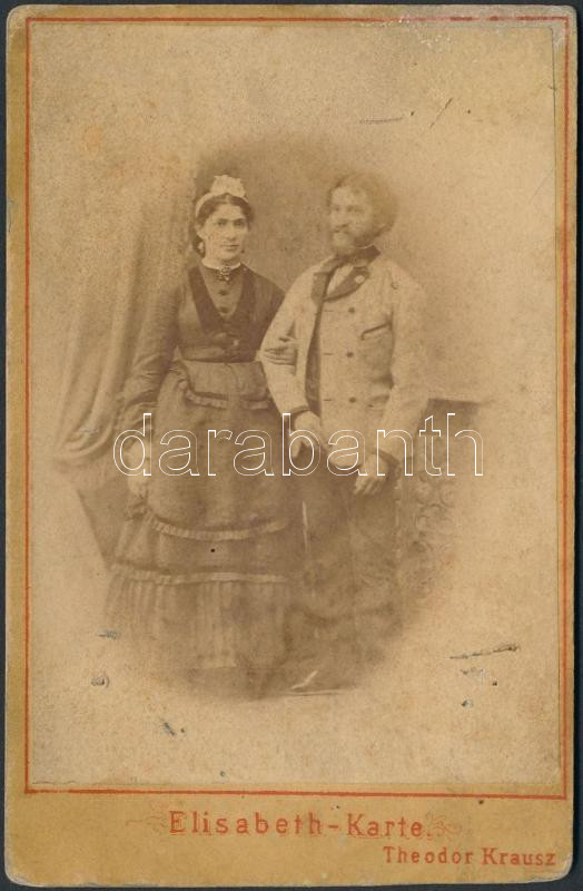Beschreibung: cca 1880 Rasovszky Mór és felesége, Strelinger Józsa, keményhátú fotó Theodor Krausz műterméből, hátulján feliratozva, 13×8,5 cm