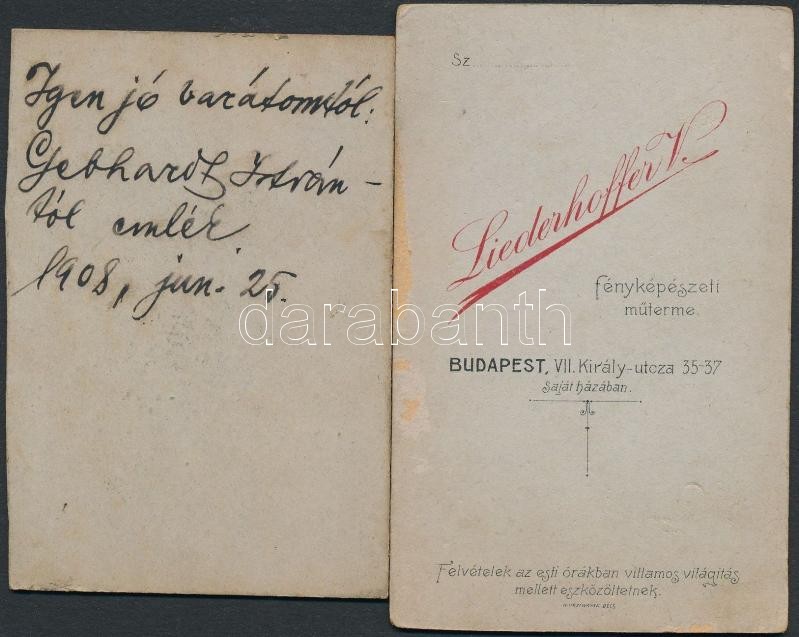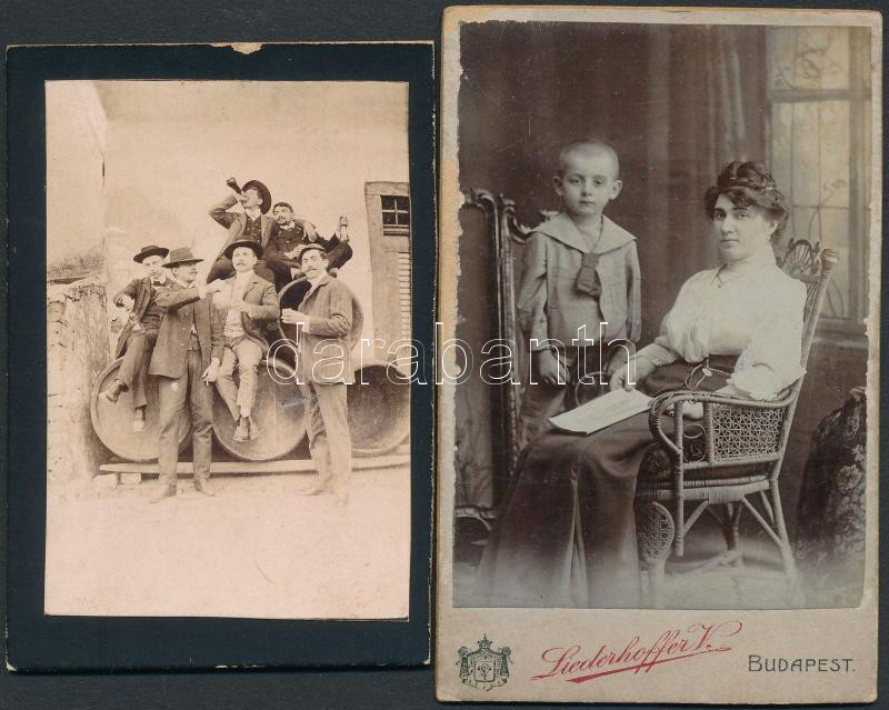 cca 1900 2 db kemény hátú fotó, 'a borozók'(,a hátoldalán ajándékozási sorokkal és dátumozással (1908)), és egy Liederhoffer műtermi fotó, 9.5x6.5 cm. és 10.5x6.5 cm.
