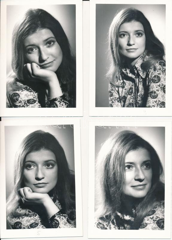 Beschreibung: cca 1974 Kutvölgyi Erzsébet színésznő, 4 db szabadon felhasználható vintage negatív (7x6 cm) és 4 db vintage pozitív kép, 10x7 cm