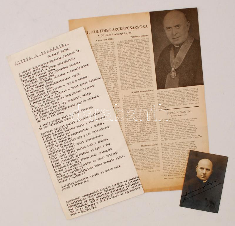 cca 1936-1943 Harsányi Lajos (1883-1959) költő, győri kanonok aláírt fotója, hátulján üdvözlő sorokkal; Jönnek a barbárok című versének gépirata, valamint a Zászlónk katolikus diáklap Harsányi 60. születésnapja alkalmából írt cikke /