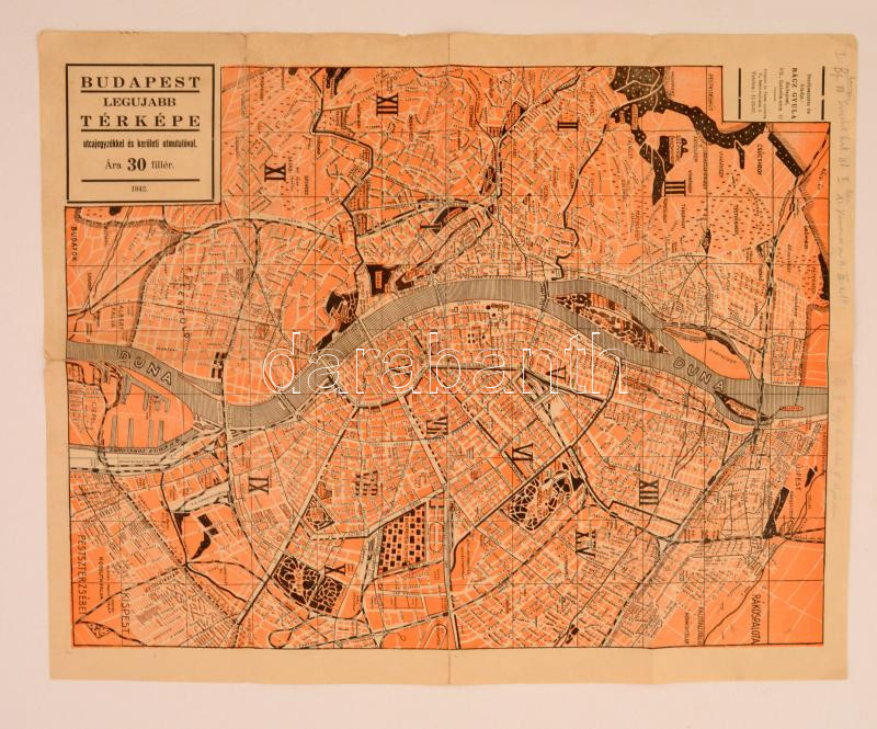 1942 Budapest legújabb térképe utcajegyzékkel és kerületi útmutatóval,... https://www.darabanth.com/de/279-Fernauktion/279.0/Andere-Sammelgebiete/Landkarten~26/1942-Budapest-legujabb-terkepe-utcajegyzekkel-es-keruleti-utmutatoval-leptek-nelkul-a-~II1434983