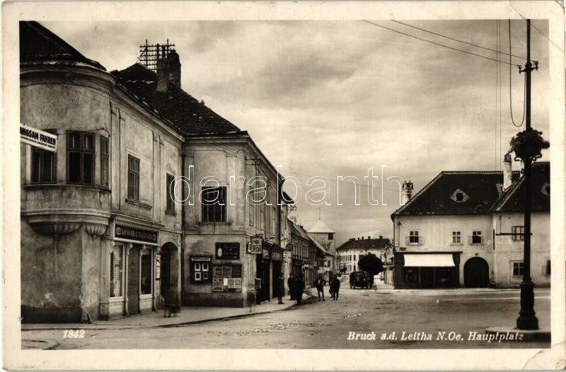 Beschreibung: Lajtabruck, Bruck and der Leitha; Fő tér, Konrad Danzinger üzlete / main square, shop (EK)