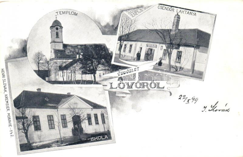 Beschreibung: 1899 Lövő, templom, Csendőrlaktanya, Madarász Pál üzlete, iskola, kiadja Henri Slovak, cseh kiadás