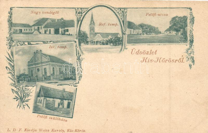 Beschreibung: Kiskőrös, Nagy vendéglő, Református templom, Petőfi utca és szülőház, zsinagóga, floral, L.D.F. kiadja Weiss Károly (vágott / cut)