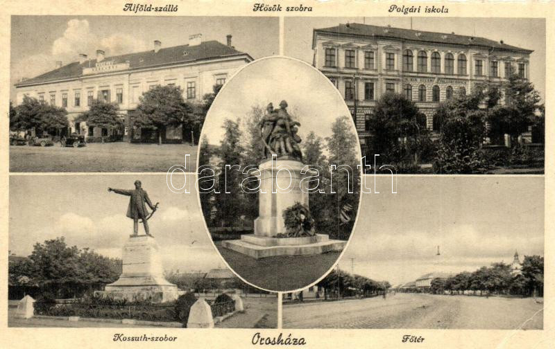 Beschreibung: Orosháza, Alföld szálló, Hősök szobra, Polgári iskola, Kossuth szobor, Fő tér (EK)