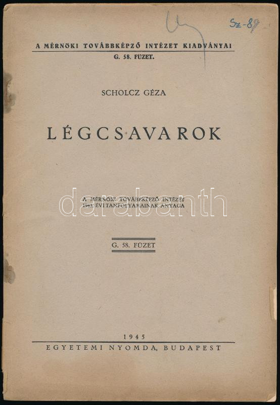 Scholcz Géza: Légcsavarok. Mérnöki Továbbképző Intézet Kiadványai G. 58. füzet. Budapest, 1945, Egyetemi Nyomda. Kiadói papírkötésben, picit viseltes borítóval.