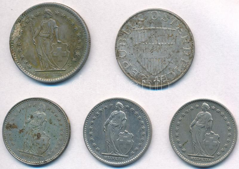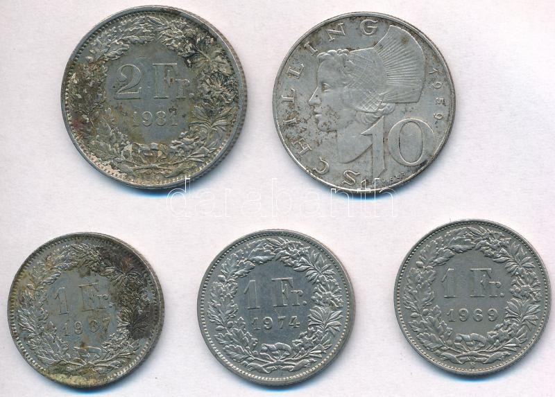 Beschreibung: Vegyes: Ausztria 1959. 10Sch Ag + Svájc 1969-1987. 1Fr (3xklf) + 2Fr T:2 patina