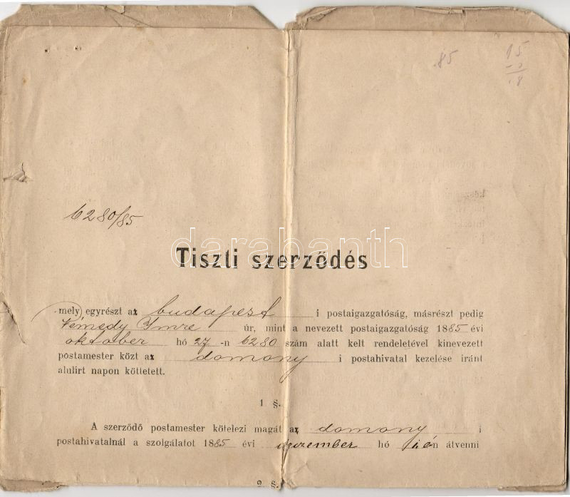 1885 Tiszti szerződés postamesteri állás betöltésére (szakadások) https://www.darabanth.com/de/28-Fernauktion/28.0/Andere-Sammelgebiete/~87/1885-Tiszti-szerzodes-postamesteri-allas-betoltesere-szakadasok~II51150