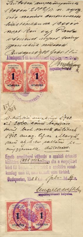 Beschreibung: 1908 Anyakönyvi értékesítés 4x1K anyakönyvi kivonati díj bélyeggel