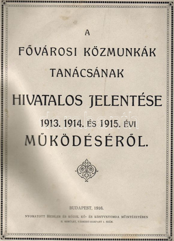 Beschreibung: 1916 A Fővárosi Közmunkák tanácsának hivatalos jelentése az 1913, -14, -15. évi működéséről; Heisler és Kozol nyomda