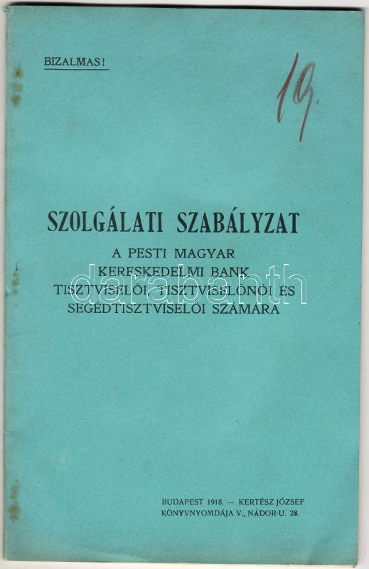 1918 Szolgálati szebályzat a pesti magyar kereskedelmi bank tisztvisel... https://www.darabanth.com/de/28-Fernauktion/28.0/Andere-Sammelgebiete/~87/1918-Szolgalati-szebalyzat-a-pesti-magyar-kereskedelmi-bank-tisztviseloi-szamara-Kertesz-Joz~II51128