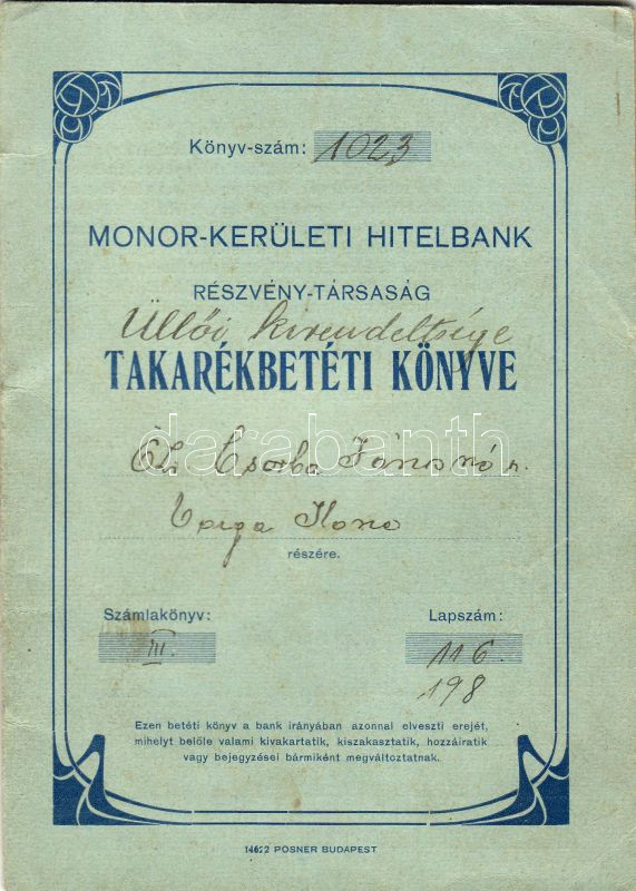 Beschreibung: 1933 Monor-Kerületi Hitelbank Rt. takarékbetéti könyve