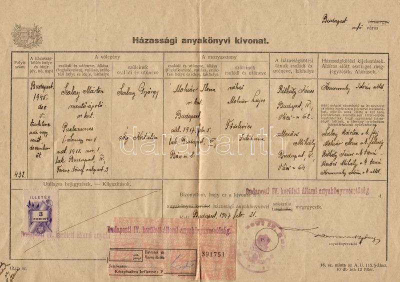 1947 Házassági anyakönyvi kivonat biankó városi illeték https://www.darabanth.com/de/28-Fernauktion/28.0/Andere-Sammelgebiete/~87/1947-Hazassagi-anyakonyvi-kivonat-bianko-varosi-illetek~II51284
