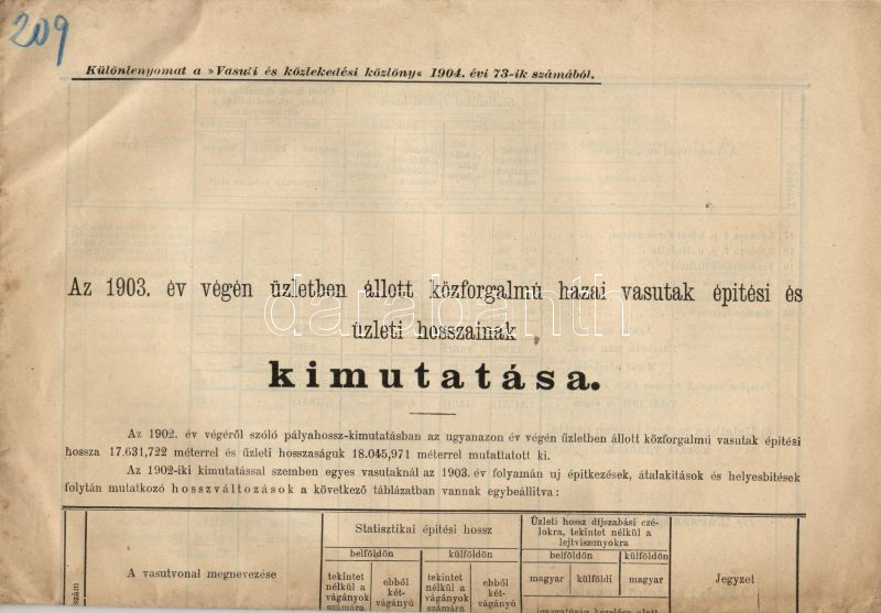 Beschreibung: Az 1903 év végén üzletben állott közforgalmú vasutak építési és üzleti hosszainak kimutatása