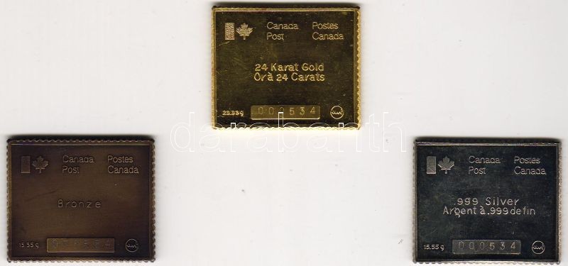 Beschreibung: Kanada 1975. "Montreal-Olympia" bélyeg formájú emlékveretek arany 23,33g, ezüst 15,55g, bronz 15,55g T:PP,BU számozva, hozzávaló fa díszdobozban