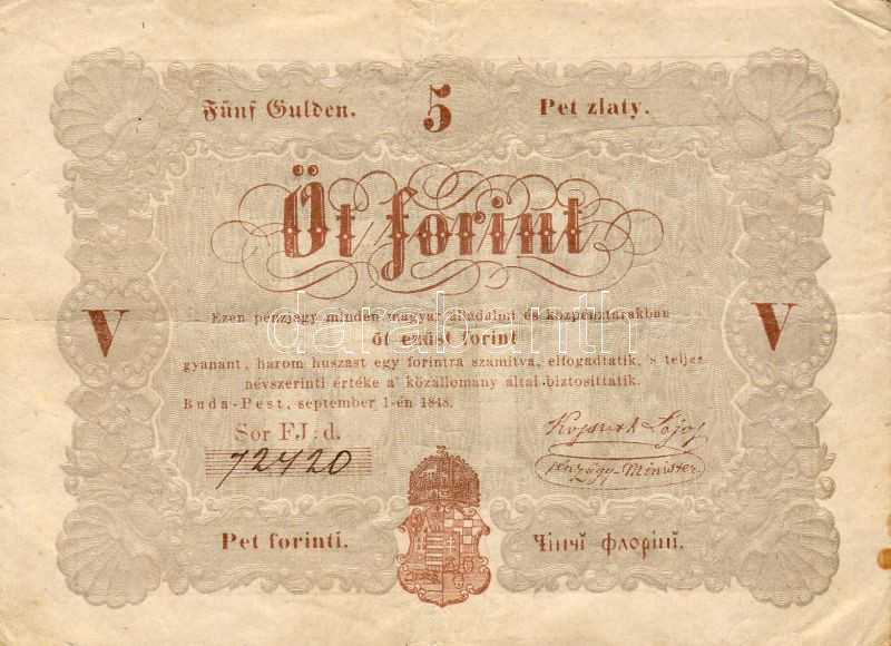 1848. 5Ft "Kossuth-bankó" T:II/III https://www.darabanth.com/de/28-Fernauktion/28.0/Numismatik/~89/1848-5Ft-Kossuth-banko-TIIIII~II51573