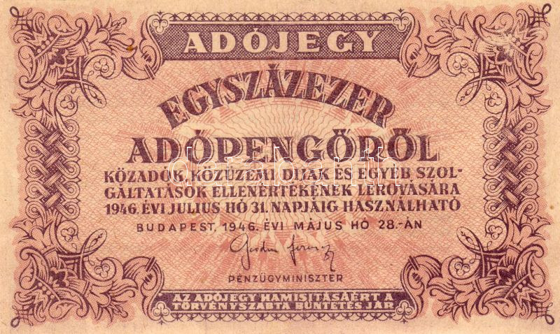 1946. 100.000Adóp. számozás nélkül, több szövegrész vastagon nyomva T:... https://www.darabanth.com/de/28-Fernauktion/28.0/Numismatik/~89/1946-100000Adop-szamozas-nelkul-tobb-szovegresz-vastagon-nyomva-TI~II51545