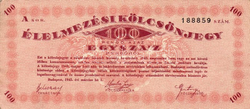 1945. 100P "Élelmezési kölcsönjegy" T:II https://www.darabanth.com/de/28-Fernauktion/28.0/Numismatik/~90/1945-100P-Elelmezesi-kolcsonjegy-TII~II51539