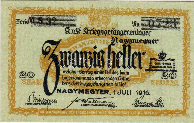 Nagymegyer/ Hadifogolytábor 1916. 20f T:I https://www.darabanth.com/de/28-Fernauktion/28.0/Numismatik/~90/Nagymegyer-Hadifogolytabor-1916-20f-TI~II51555