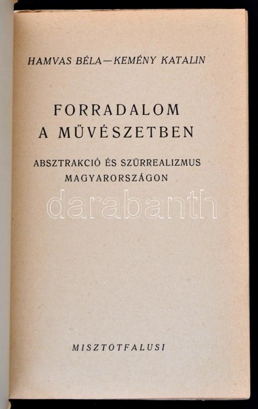 Hamvas Béla-Kemény Katalin: Forradalom a művészetben. Absztrakció és szürrealizmus Magyarországon. A borítót Lossonczy Tamás tervezte. Bp.,(1947), Misztófalusi, Műegyetemi Nyomda, 112 p. Első kiadás. Kiadói papírkötés, kissé javított gerinccel, az elülső borítón kis szakadással, jó állapotban. Lukács György (1885-1971) 1948-ban politikailag károsnak minősítette. Hamvas Bélát (1897-1968) b-listázták, kényszernyugdíjazták, publikációs és szerkesztési jogaitól is megfosztották. Feleségét Kemény Katalint (1909-2004) hallgatásra ítélték.