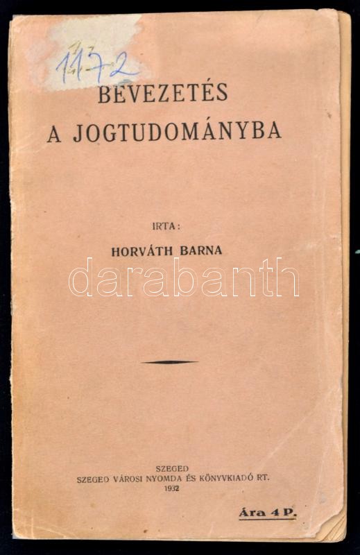 Horváth Barna: Bevezetés a jogtudományba. Szeged, 1932, Szegedi Városi Nyomda és Könyvkiadó Rt., 149 p. Első kiadás. Kiadói papírkötés, az elülső borító ragasztott, javított, ceruzás aláhúzásokkal, bejegyzésekkel, intézményi bélyegzővel. Horváth Barna (Bp., 1896. - New York, 1973.) jogfilozófus, egyetemi tanár, az MTA tagja. 1948-tól az USA-ban élt. Az újkantiánus jogbölcselet képviselője. Elsősorban jogelmélettel, jogfilozófiával, jogszociológiával foglalkozott.
