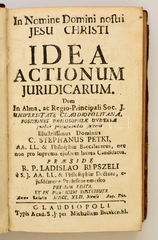 Répszeli László: Idea actionum juridicarum Dum in ... soc. J. universitate Claudipolitana, positiones philosophiae universae publice propugnandas s uscepit C. Stephanus Petki, ... praeside R. P. Ladislao Répszeli .... Claudiopoli, 1742. in acad. s. J. per Mich. Becskereki. M. 336p + XIV. Korabeli kopott aranyozású egészbőr kötésben. Ritka jogi munka! / In leather binding.
