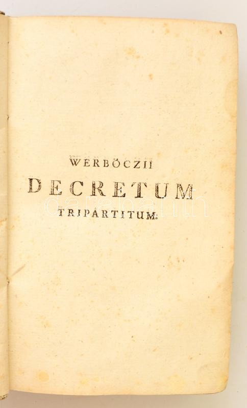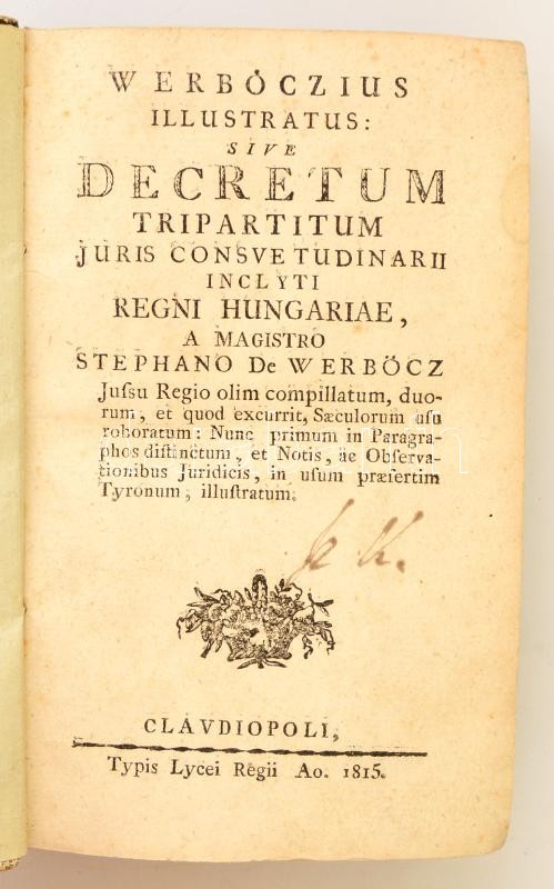 Werböczius illustratus sive decretum tripartitum juris generale incl. Regni ... Claudiopoli. 1815. Typis Lycei Regii. 569p. + XL Hátsó szennylapon hiány. Korabeli, kissé szakadt karton kötésben. Ritka kiadás! / Paper binding, slightly worn, Rare!
