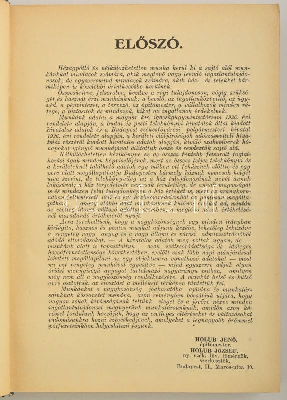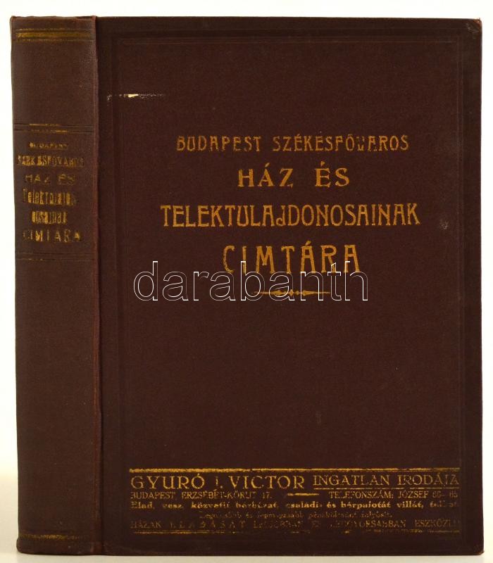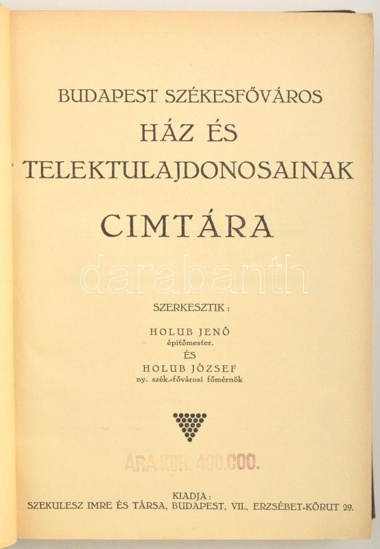 Budapest székesfőváros ház és telektulajdonosainak címtára. Szerk.: Holub Jenő, és Holub József. Bp.,(cca 1926), Szekulesz Imre és Tsa, (Hauptmann Béla kő- és könyvnyomdai műintézet), 417+3 p.+ 10 t. Kiadói aranyozott egészvászon-kötés, kissé kopott borítóval, kissé sérült kötéssel, egy-két ceruzás aláhúzással, egyébként jó állapotban, korabeli reklámokkal. Ritka!