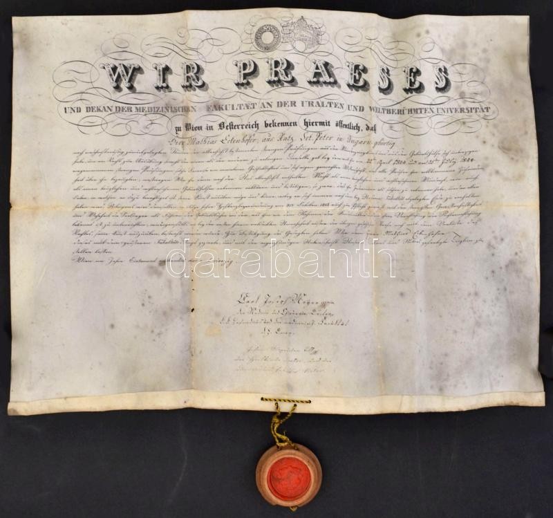 1844 A bécsi egyetem függőpecsétes diplomája magyar diák részére, perg... https://www.darabanth.com/de/28-Gross-Auktion/28.1/Andere-Sammelgebiete/Dokument~11180/1844-A-becsi-egyetem-fuggopecsetes-diplomaja-magyar-diak-reszere-pergamen-szignettaval~II1649309
