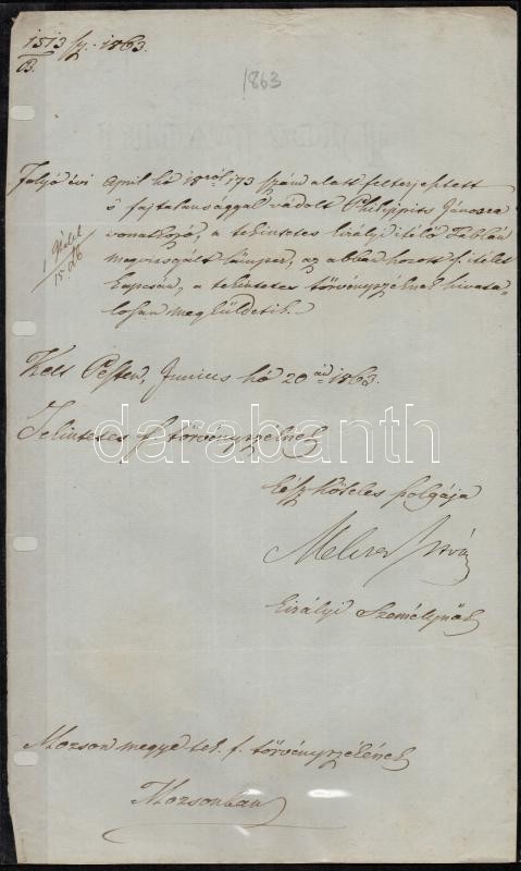1863 Melzer István királyi személynök aláírt levele fajtalansággal vád... https://www.darabanth.com/de/28-Gross-Auktion/28.1/Andere-Sammelgebiete/Dokument~11180/1863-Melzer-Istvan-kiralyi-szemelynok-alairt-levele-fajtalansaggal-vadolt-ferfi-ugyeben-~II1682251