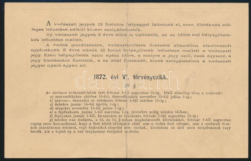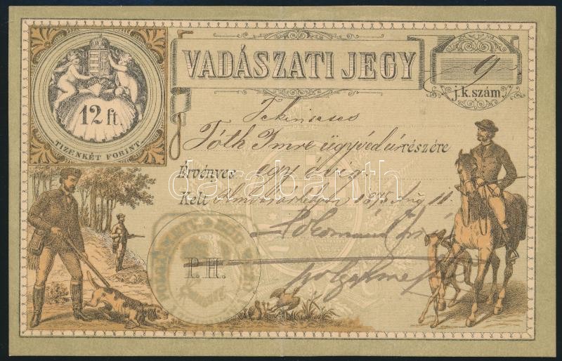 1875 Hódmezővásárhely 9. számú vadászati jegy 12Ft / 12Ft Litho hunter... https://www.darabanth.com/de/28-Gross-Auktion/28.1/Andere-Sammelgebiete/Dokument~11180/1875-Hodmezovasarhely-9-szamu-vadaszati-jegy-12Ft-12Ft-Litho-hunters-licence-Nr-9-koz~II1679879