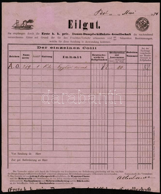 1875 Rózsaszín DDSG szállítólevél 5kr illetékbélyeggel / Pink DDSG bil... https://www.darabanth.com/de/28-Gross-Auktion/28.1/Andere-Sammelgebiete/Dokument~11180/1875-Rozsaszin-DDSG-szallitolevel-5kr-illetekbelyeggel-Pink-DDSG-bill-of-freight~II1588423