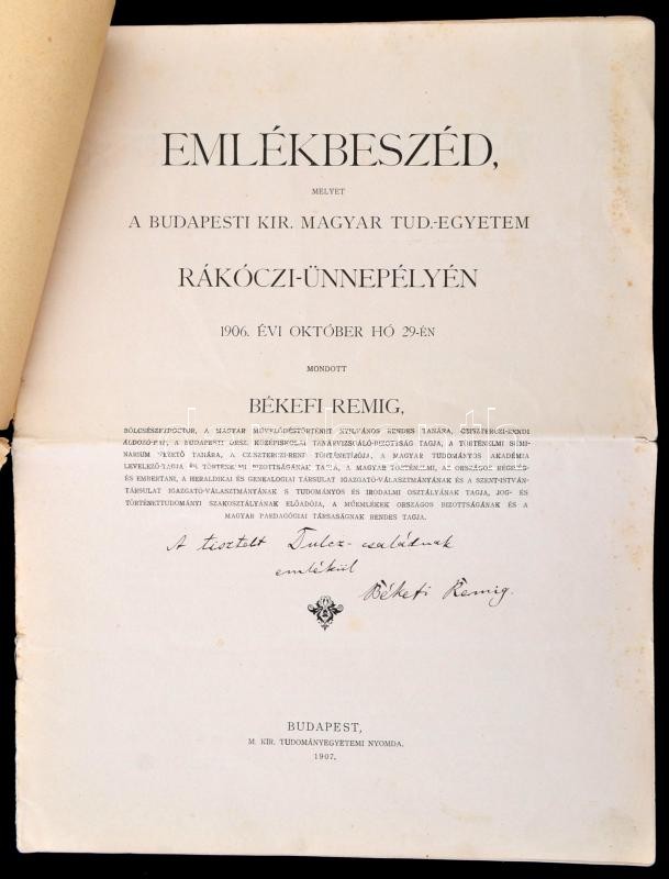 1907 Békefi Remig: Emlékbeszéd melyet a Budapesti Kir. Magyar Tud.-Egyetem Rákóczi-Ünnepélyén 1906. évi október hó 29-én mondott Békefi Remig. Bp.,1907, M. Kir. Tudományegyetemi Nyomda, 12 p. Kiadói papírkötés, szakadozott állapotban. A szerző által dedikált.