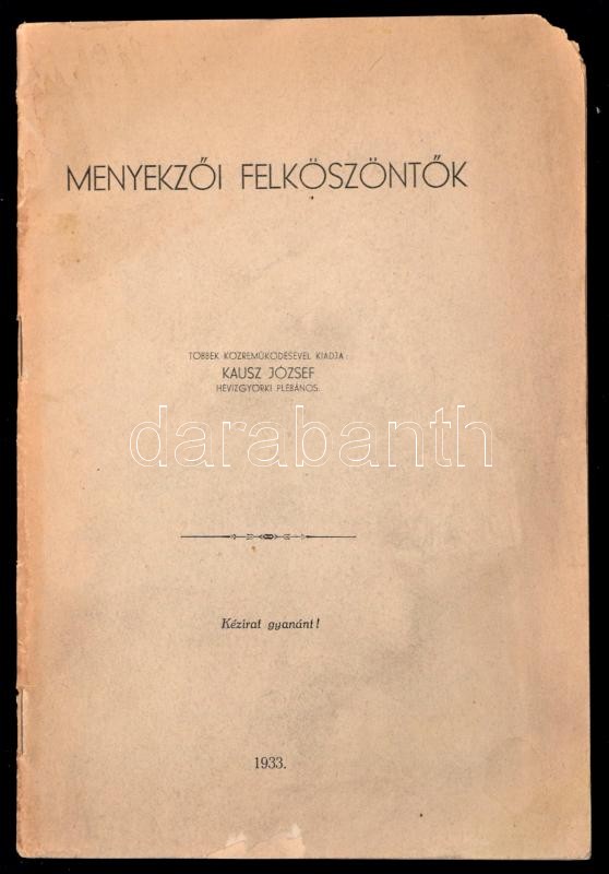 1933 Mennyekzői felköszöntők. Többek közreműködésével kiadja: Kausz József, hévízgyörki plébános. Kézirat gyanánt! Vác, 1933, Kapisztrán Nyomda, 28 p. Papírkötésben, a lapok felső sarka kissé sérült, picit hiányos.