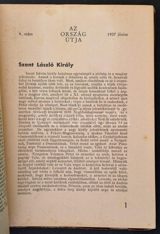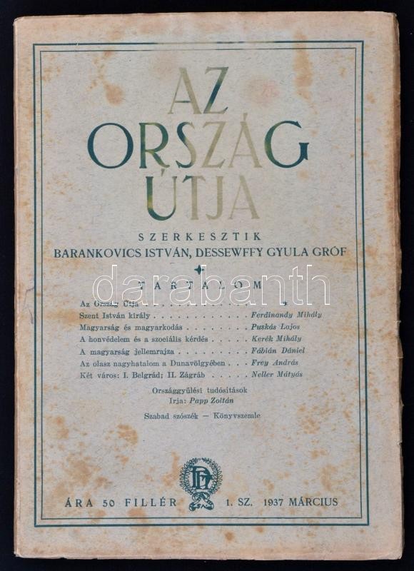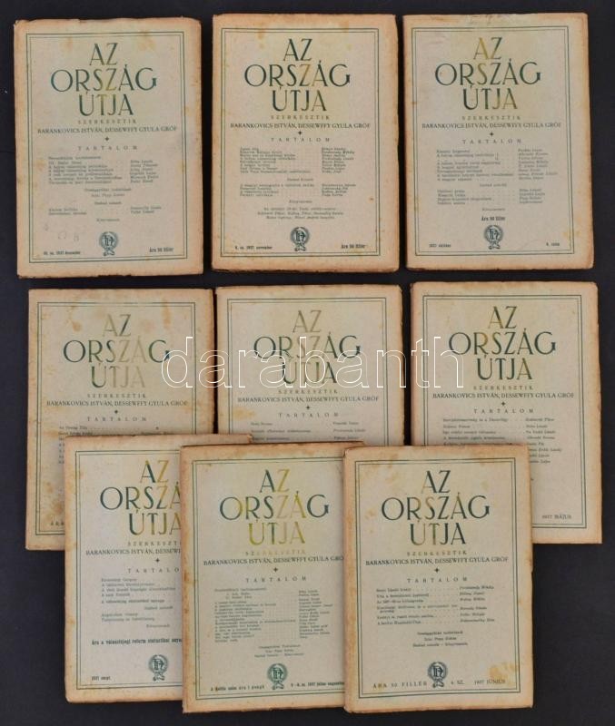 1937 Az ország útja. Állam és nemzetpolitikai folyóirat. Szerk.: Barankovics István, Dessewffy Gyula. 1937. március-december, 1-10. számok.(5-6. dupla szám.) Első, teljes évfolyam. Bp., Deák Ferenc Társaság. Papírkötés, kissé foltos borítókkal, két szám kijár a borítóból, de a könyvtest egyben van, Udvardi és Básthi dr. Udvardy Jenő (1880-1941) jogász, kormányfőtanácos, zalaegerszegi ügyvédi kamara elnökének ex libris-szeivel. (8 db.)