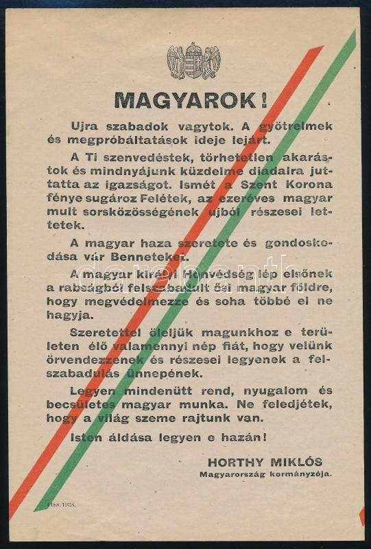 1938 "Magyarok! Újra szabadok vagytok!" A felvidéki bevonulá... https://www.darabanth.com/de/28-Gross-Auktion/28.1/Andere-Sammelgebiete/Drucksachen~11191/1938-Magyarok-Ujra-szabadok-vagytok-A-felvideki-bevonulas-alkalmabol-nyomtatott-szorolap-~II1681858