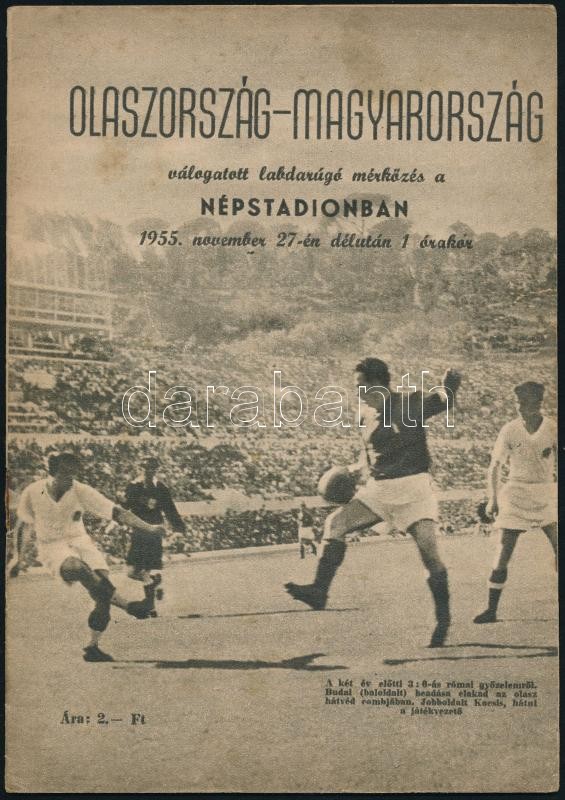 1955 Az Olaszország-Magyarország válogatott labdarúgó mérkőzés műsorfü... https://www.darabanth.com/de/28-Gross-Auktion/28.1/Andere-Sammelgebiete/Drucksachen~11191/1955-Az-Olaszorszag-Magyarorszag-valogatott-labdarugo-merkozes-musorfuzete-szamos-erdek~II1679563
