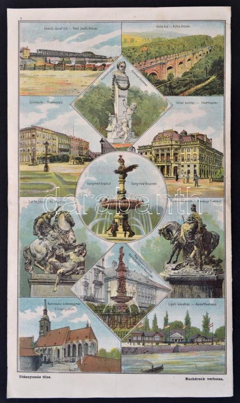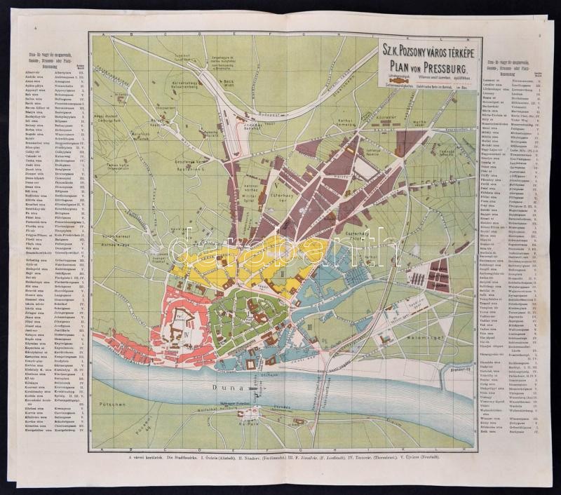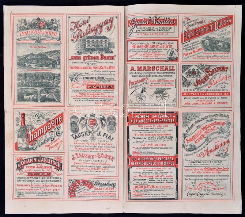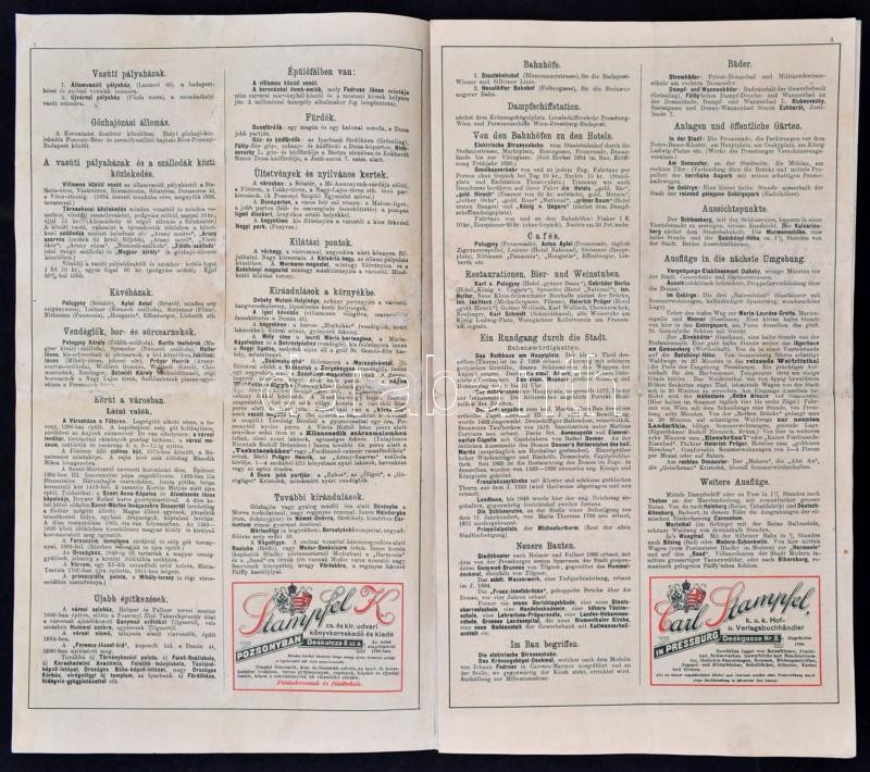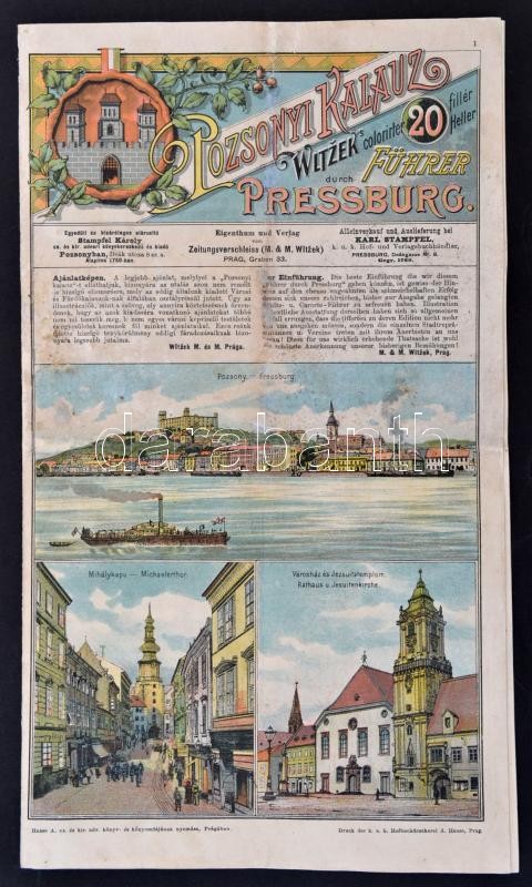 cca 1890 Pozsonyi Kalauz. Witzek colorirter durch Führer Pressburg. [Színes, képes reklámkiadvány.] Egyedüli és kizárólagos elárusító Stampfel Károly. Prága, cca 1890, Witzek,(Haase A. ny.) 8 l. A borító előlapján színes fejléccel, a borító elo- és hátlapján 14 kőnyomatú városképpel, középen a város kőnyomatú térképével,(29x32 cm). A 2-3. oldalon a fontosabb látnivalók rövid ismertetésével, a 6-7. oldalon 13 reklámmal. Magyar-német bilingvis. Hajtva, egy helyen kis kopással / Bratislava/Pressburg guide and map, with lithographic map (29x32 cm) and pictures, with descriptions of main sights and contemporary advertisment, in Hungarian and German language. Folded, in one spot little bit weary.