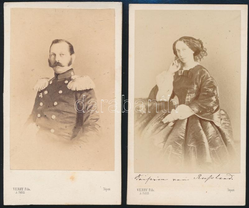1856 II. Sándor orosz cár és neje Marija Alexandrovna fényképe, mely Párizsban készült a krími háborút lezáró békekötés idején készült vizitkártya méretű fényképe. Korai vizitkártya Disdéri szabadalma alapján. Verry Fils jelzéssel / 1856 Photo of Tsar Alexander II. of Russia and his wife Marija Alexandrovna, taken in Paris at the time of the peace treaty of the Crimean war. An early carte de visité after the patent of Disderi. Signed: Verry Fils. 6.3 x 10.5 cm