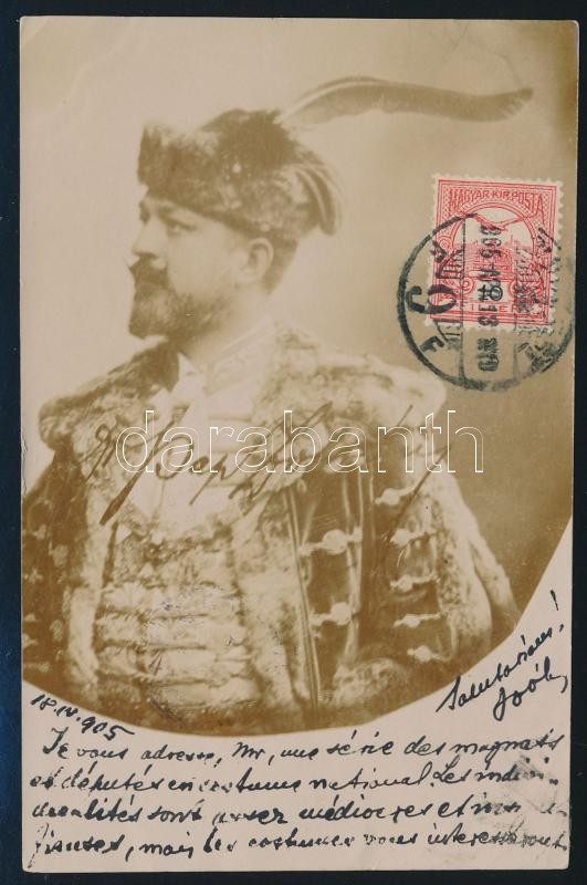 1905 Tyuskai és bilkei Papp Zoltán (1862-1919) ügyvéd, országgyűlési képviselő, költő, író, dalszerző fényképe díszmagyarban aláírásának képével. Fotólap postán elküldve 9x15 cm