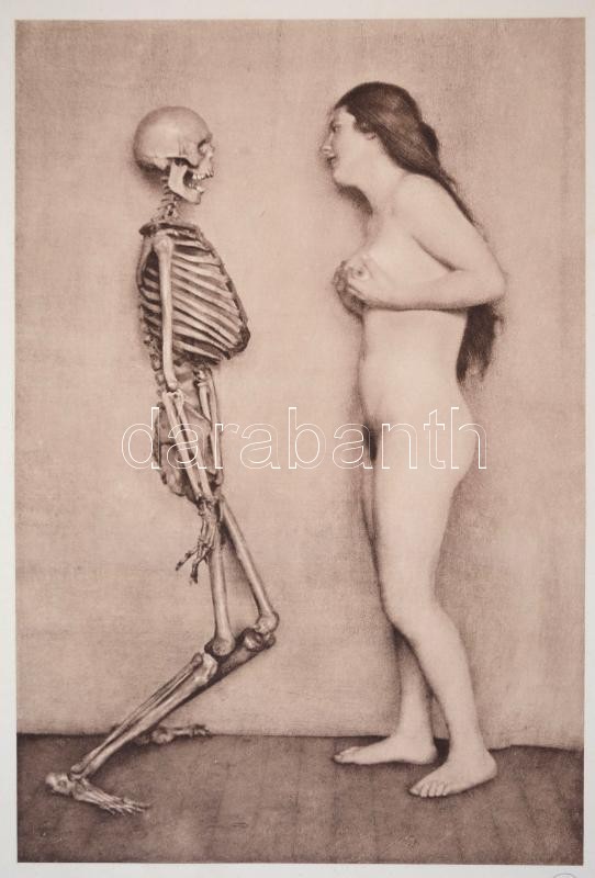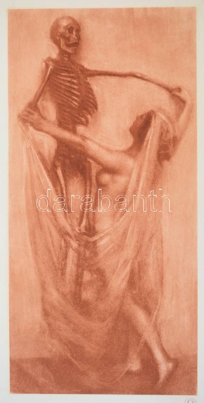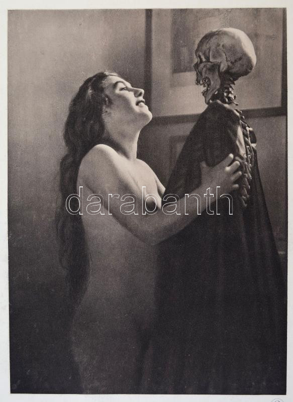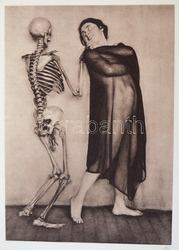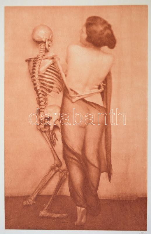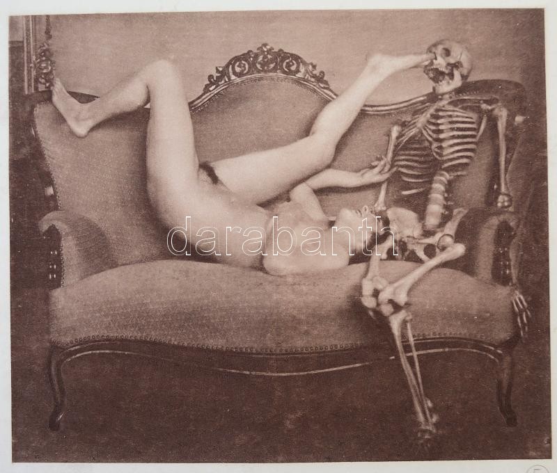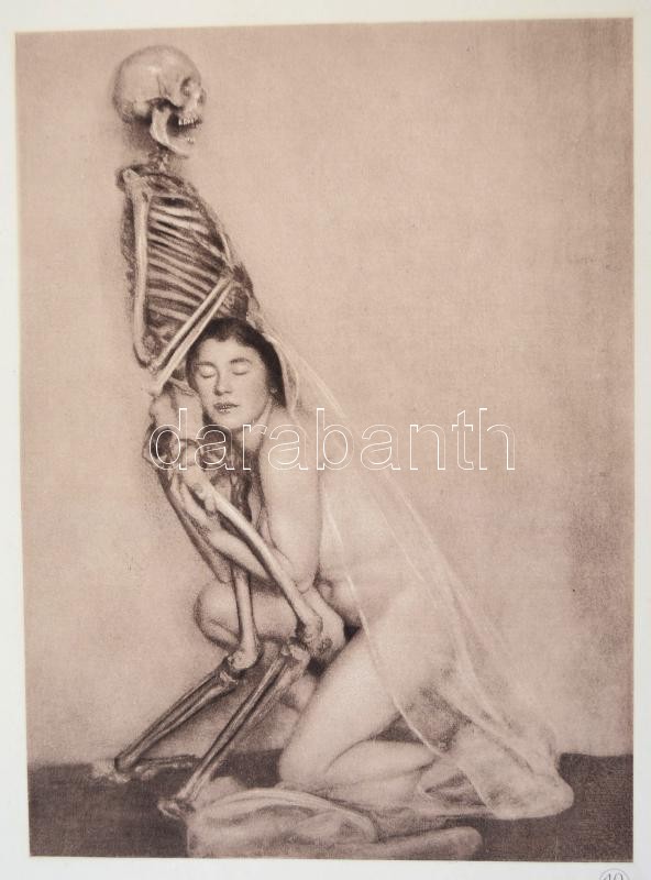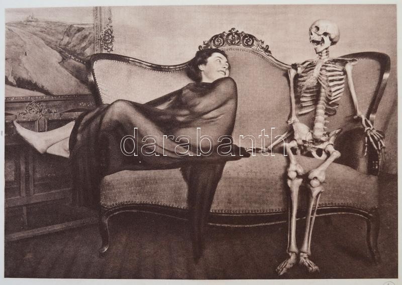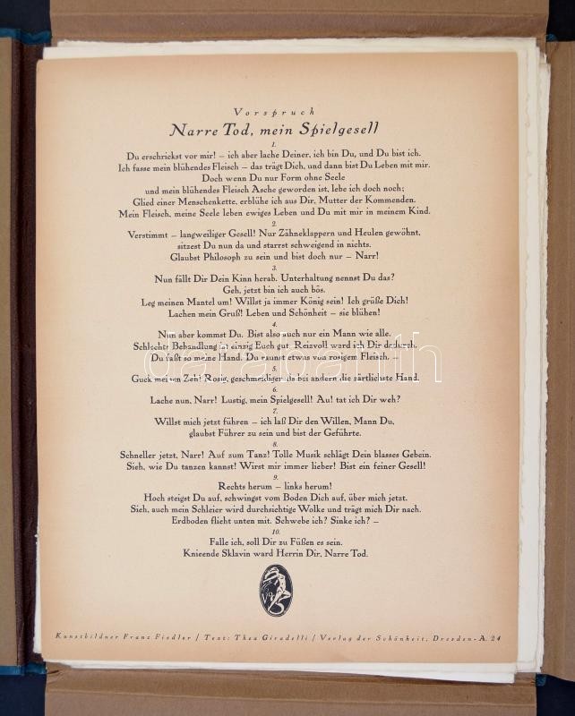 1921 Franz Fiedler (1885-1956): Narre Tod, Mein Spielgesell (Bolond Halál, játszótársam) 10 hártyapapírral elválasztott zselatinos ezüst nagyítás. Kísérőszöveggel, kiadói félvászon mappában. Hibátlan állapotban. Franz Fiedler az I. világháború utáni Új tárgyiasság Neue Sachlichkeit mozgalom képviselője. Erotikus és a danse macabret körbejáró fotómappája nemzetközileg keresett ritkaság, mely ilyen szép és komplett állapotban igazi unikum. / 1921 Franz Fiedler (1885-1956): Narre Tod, Mein Spielgesell (Fool Death, My Playmate) 10 pieces vintage gelatin silver prints with the text of Thea Girardelli in original portfolio. In very nice condition. Erotica, macabre. Rarity! 27x35 cm