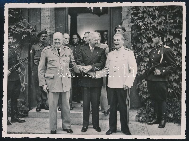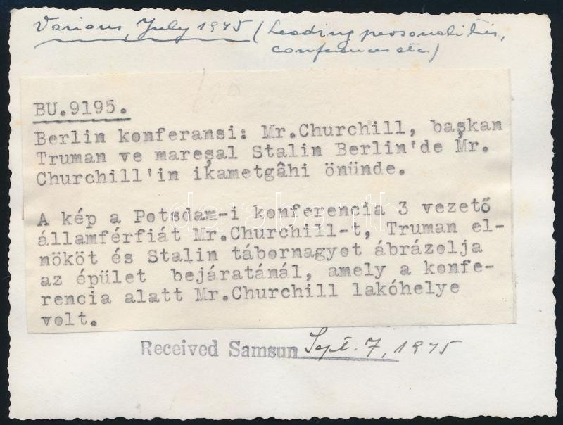 1945 Sajtófotó a Potsdami Konferenciáról. Sztálin, Churchill, Truman. magyar és török nyelvű felirattal / 1945 Original press photo from the Conference of Yalta. inscribed in Turkish and Hungarian. 12x9 cm