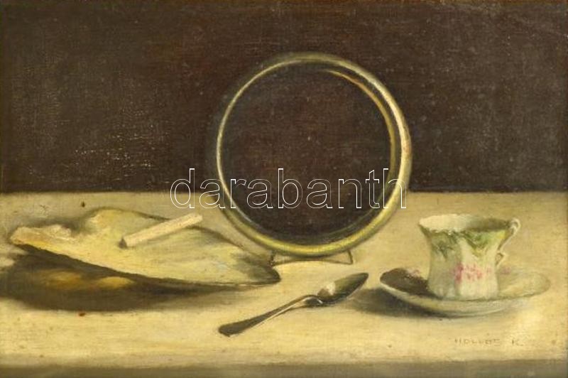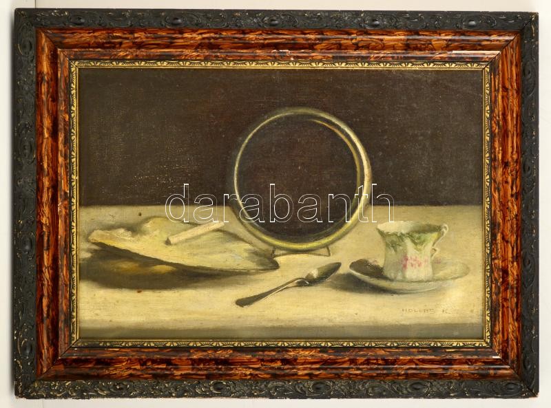 Beschreibung: Hollós Holczer Károly (1873-?): Asztali csendélet. Olaj, vászon, jelzett, keretben, 30×46 cm