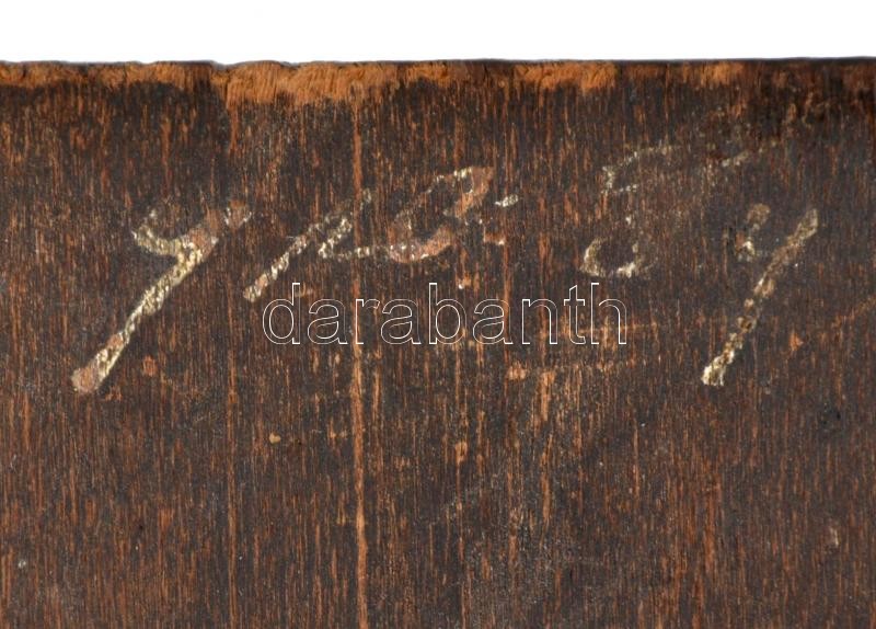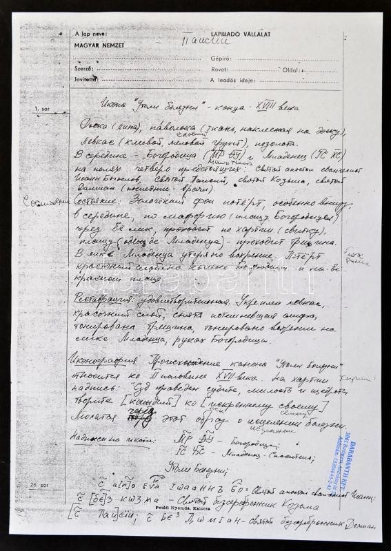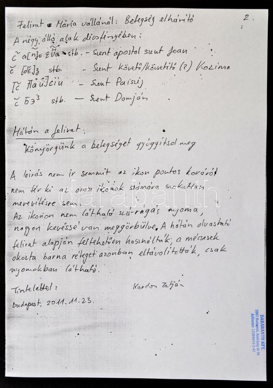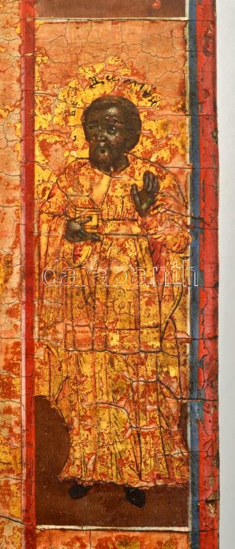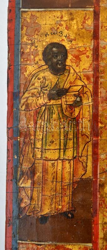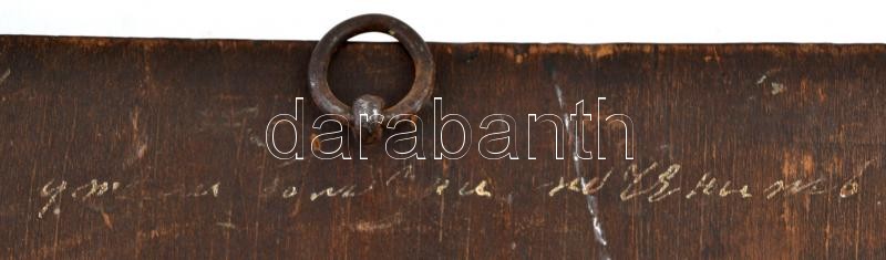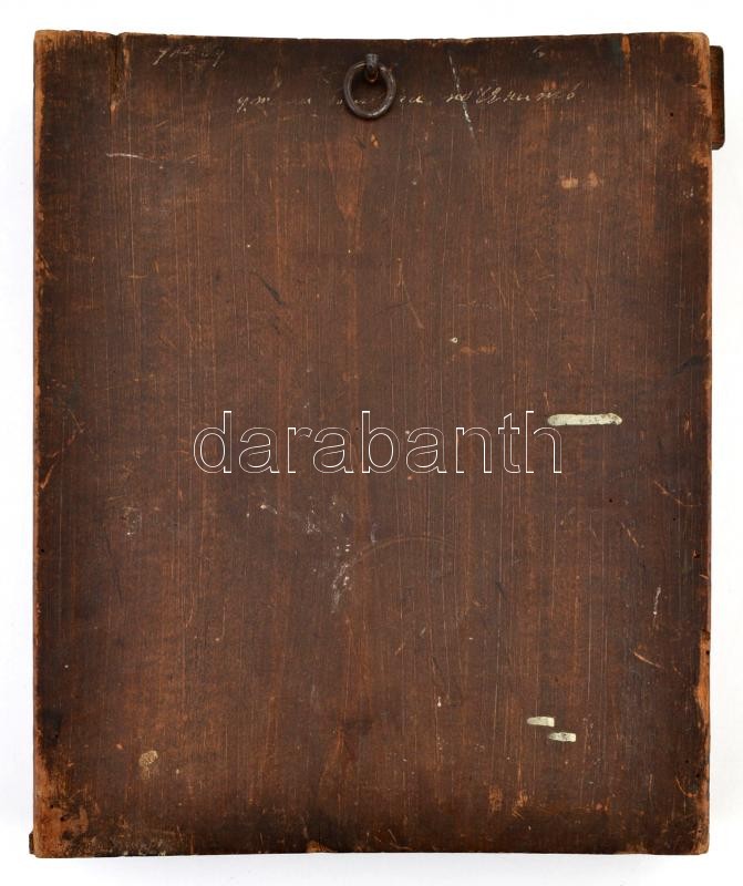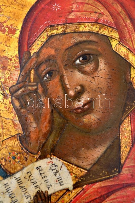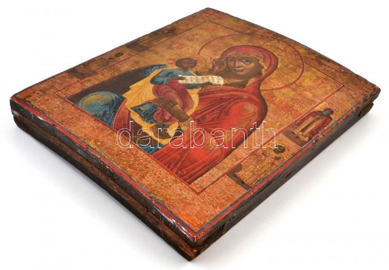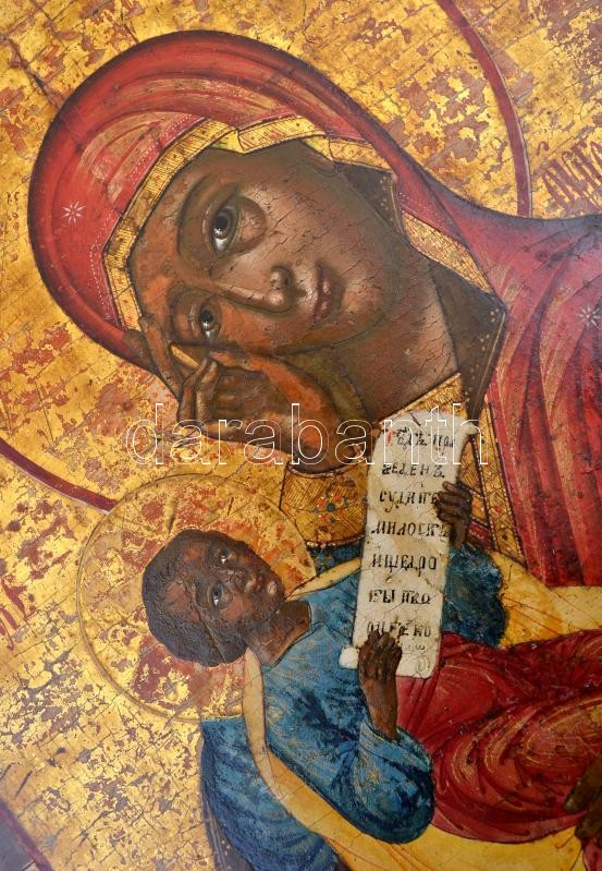 XVIII. század végi orosz ikon: Betegségek elhárítója. ( Szűz Mária a kis Jézussal). Tojástempera, vászon-fatábla, restaurált, több helyen kopott, fénymásolt orosz és magyar leírással, 36×31 cm